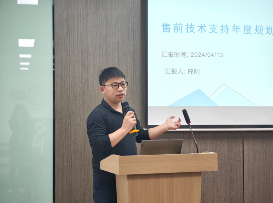 售前技术部总监邢刚做了售前技术规划及管理的分享,强调标准化与效率化。售前技术人员应以专业的技术,高效的输出,赢得客户的信任,与商务联动,拿下订单。